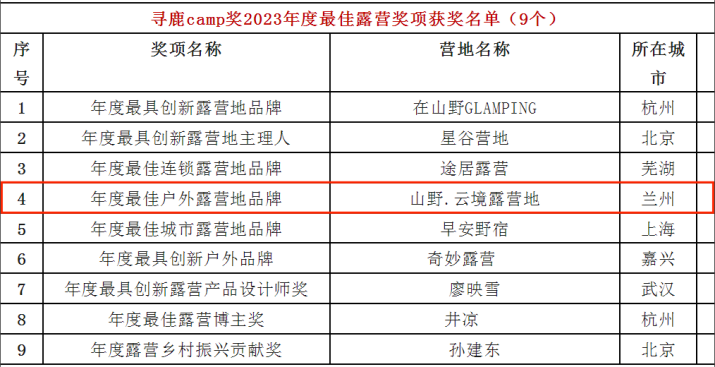 石佛溝國家森林公園山野云境露營地榮獲“首屆尋鹿CAMP獎2023年度最佳戶外露營地品牌獎