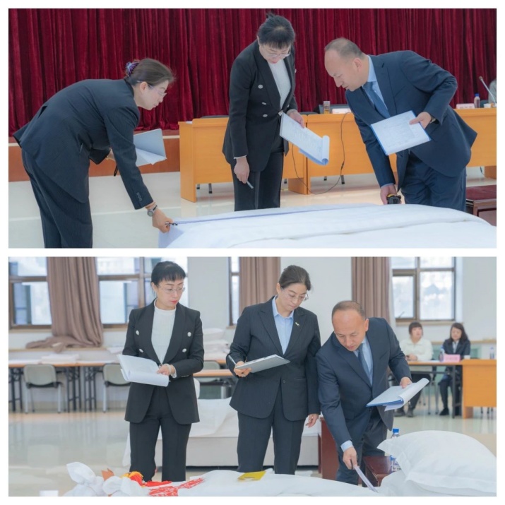 評委們認真檢查選手做床完成情況,從鋪床準備、操作規范等方面進行綜合評判。